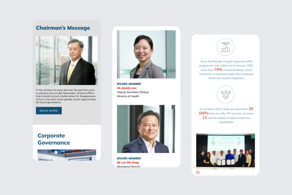 Designed to make complex industry and regulatory information accessible, the BCA Annual Report 2023 website presents content in a clear and structured format. Sections such as “Evolving Together as One,” “Enhancing Safety across the Built Environment,” and “Embracing Our People and Planet” allow readers to easily navigate and explore key insights.