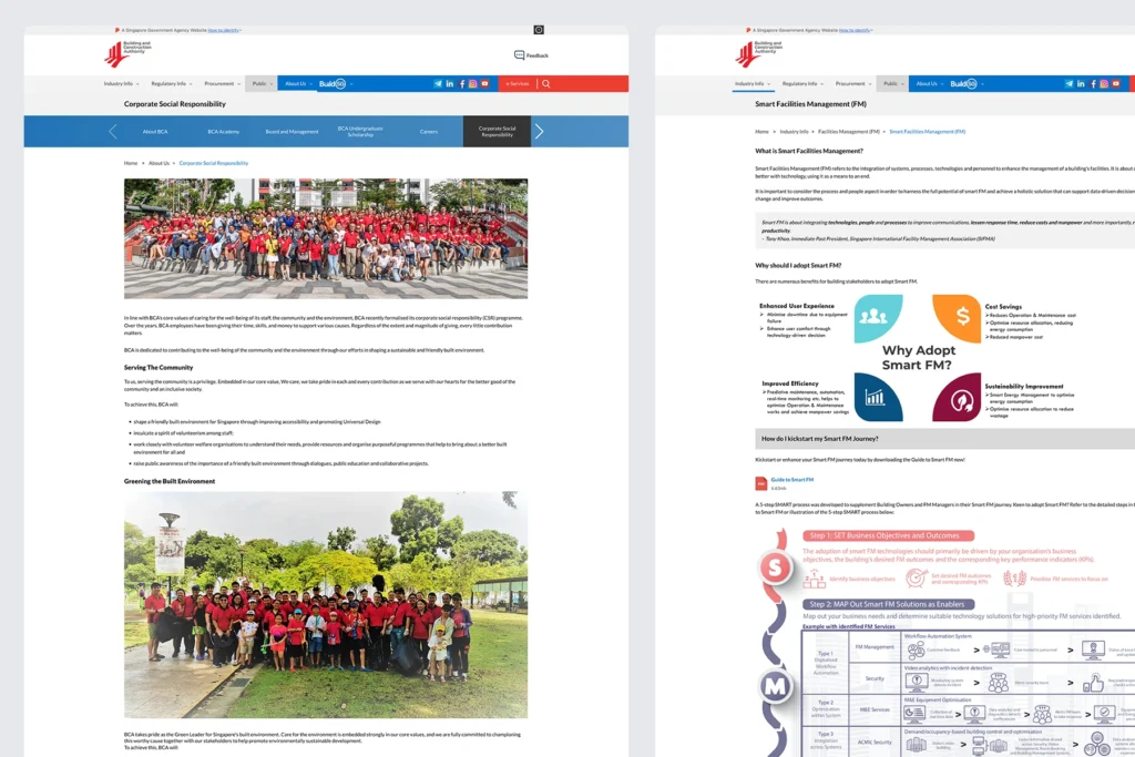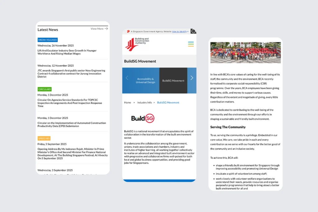 The website for BCA was built to deliver a clear, organised, and accessible platform for stakeholders across Singapore’s construction and built‑environment sector. The site provides intuitive navigation, structured content, and responsive layouts to ensure users can easily access regulatory information, e‑services, news, and resources on any device.