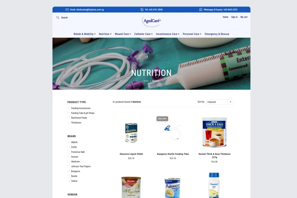 We crafted AgedCare by NTUC FairPrice as a seamless e-commerce platform for eldercare essentials. Featuring a clean interface, intuitive navigation, and responsive design, the site makes it effortless for seniors, caregivers, and families to browse and purchase products across desktop and mobile.