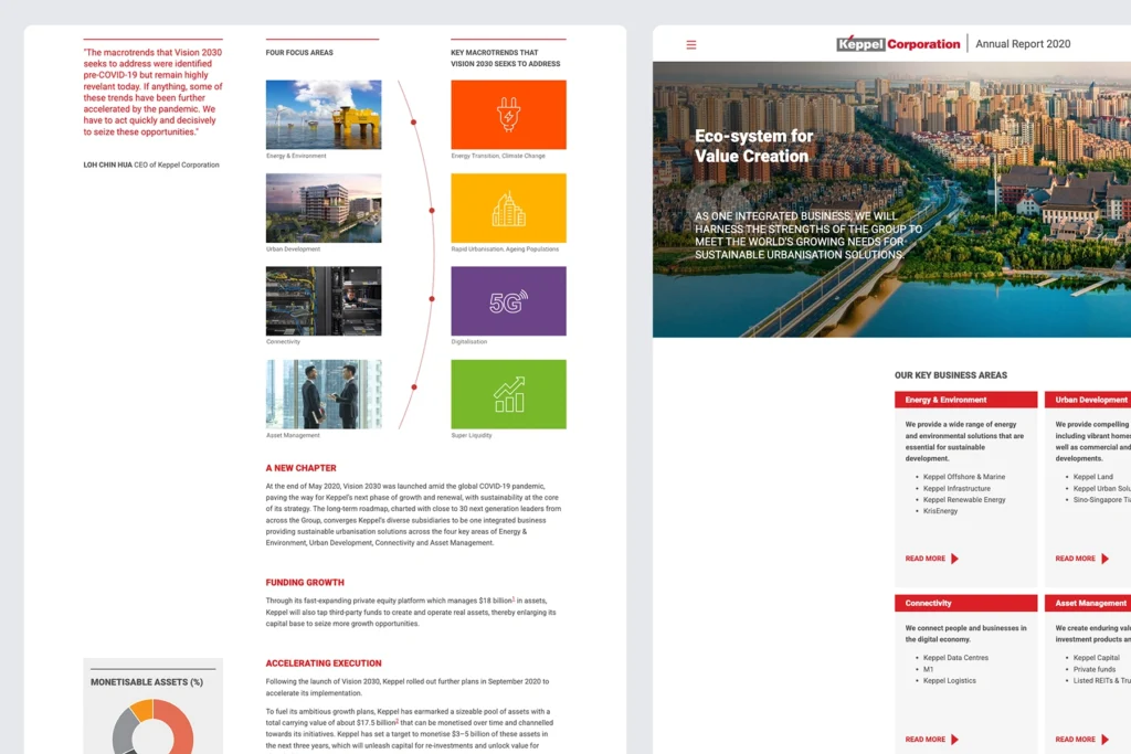 Referencing Keppel’s 2020 Annual Report, we translated their physical publication into a clean, digital-first experience. Through interactive visuals, intuitive navigation, and responsive layouts, the platform brings Vision 2030 and sustainability initiatives to life, allowing stakeholders to explore key insights seamlessly across desktop and mobile.