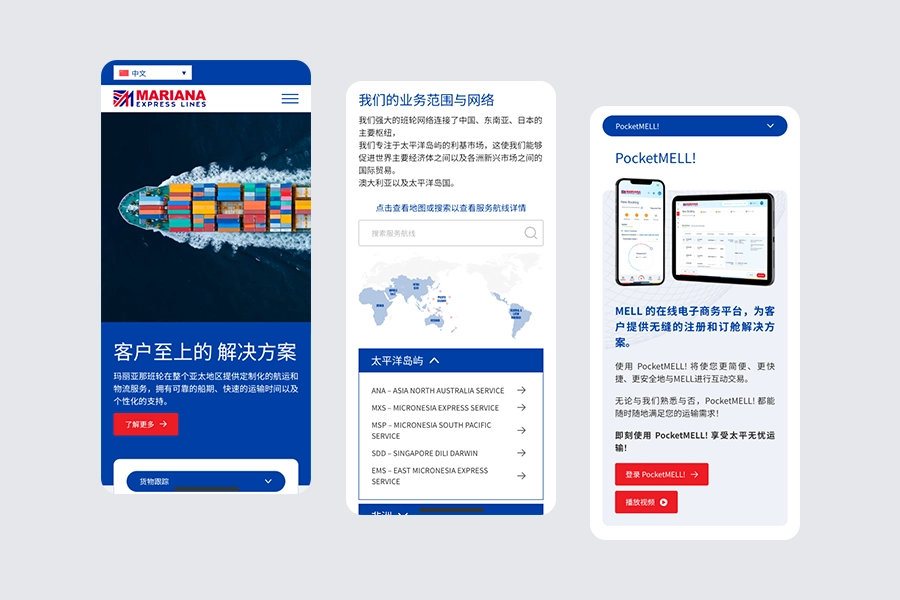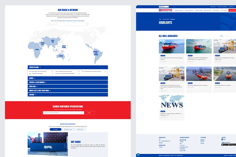 The Mariana Express Lines (MELL) website was redesigned to transform a legacy interface into a modern, intuitive digital experience. Optimised for both desktop and mobile, the refreshed layout brings sailing schedules and service routes to the forefront, ensuring global partners can access critical shipping data with speed and clarity.