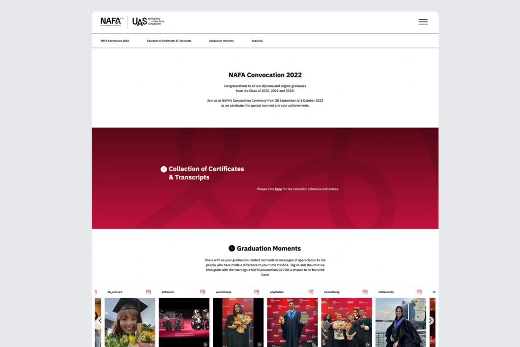 The NAFA Convocation website has been reimagined across multiple iterations to reflect the evolving spirit of celebration and achievement. Each redesign emphasizes clarity, visual hierarchy, and immersive storytelling, guiding visitors through the convocation experience with ease and elegance.