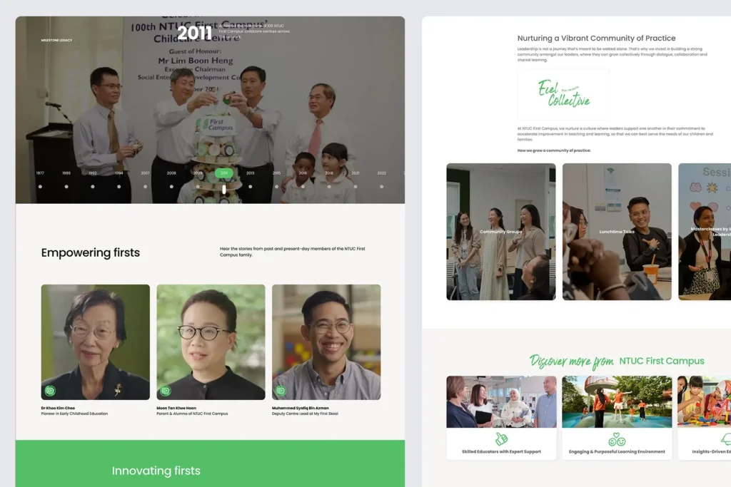 A user-focused digital experience was crafted for NTUC First Campus, elevating their online presence with a clean, modern interface, intuitive navigation, and fully responsive layouts across all devices. The improved structure and clarity help visitors easily explore programmes, initiatives, and organisational content.