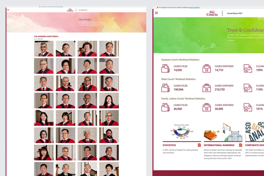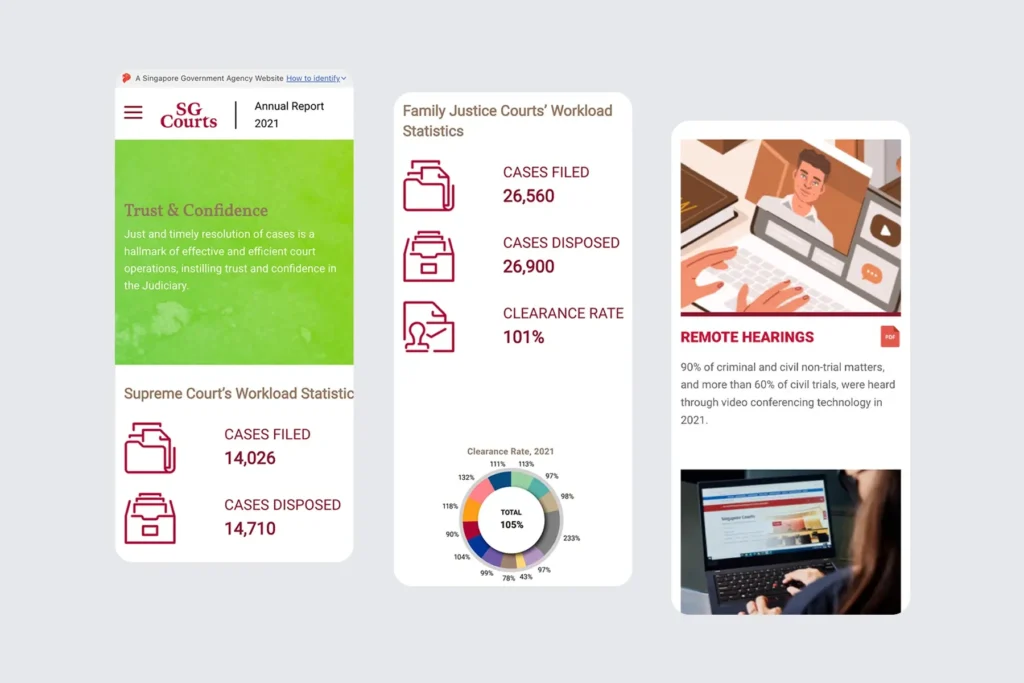 A comprehensive, user-centric microsite was built for the 2021 Annual Report of Singapore Courts, presenting key messages, milestones, and institutional highlights in a clear and accessible way. The design emphasizes readability, intuitive navigation, and responsive layouts to ensure a seamless experience across both desktop and mobile.